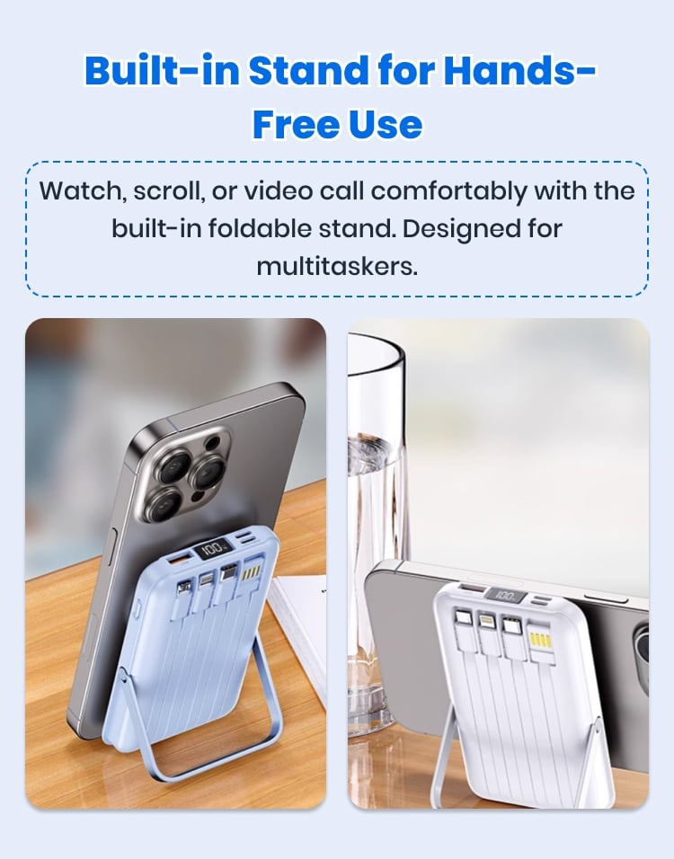 The built-in stand is super convenient. I use it to watch YouTube while charging my phone on my desk. It's great for both entertainment and work.