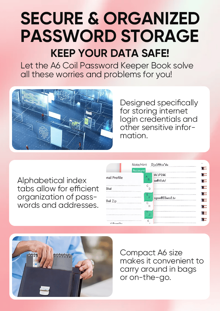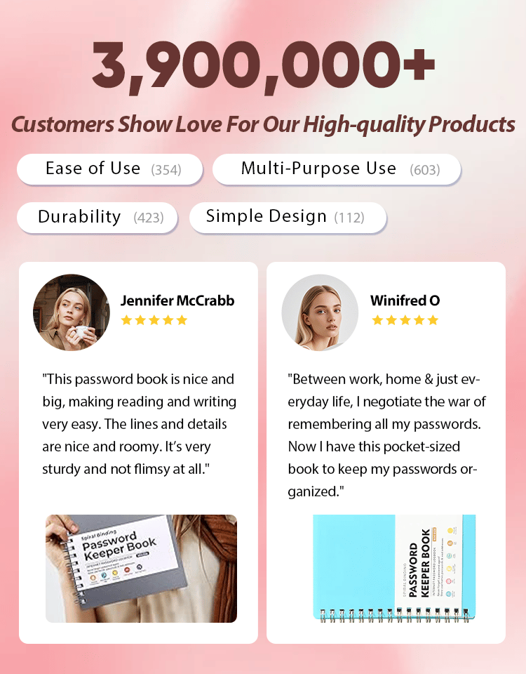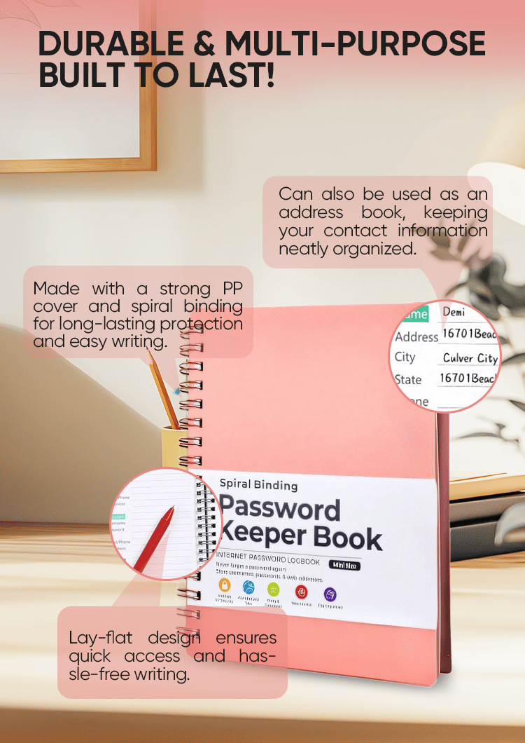 This is a cute, sturdy little notebook that I can keep handy for adding/changing passwords. It's appears to be sturdy, and has lots of pages for each alphabetical groupl