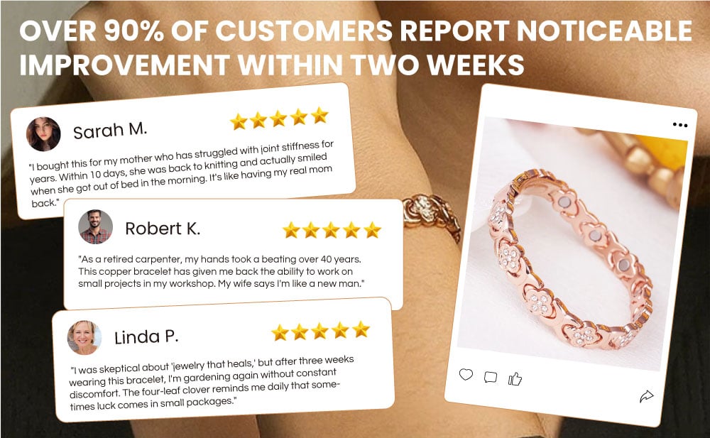 "I was skeptical but willing to try anything. After just two weeks of wearing my Flower Copper Bracelet, I noticed my hands weren't as stiff in the mornings. Now I can garden again without paying for it later! It's beautiful too - I get compliments all the time. So glad I gave this a chance!"
