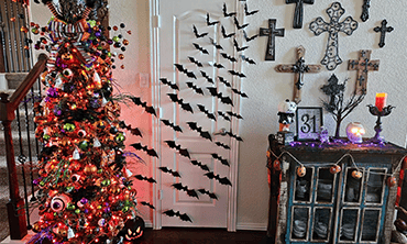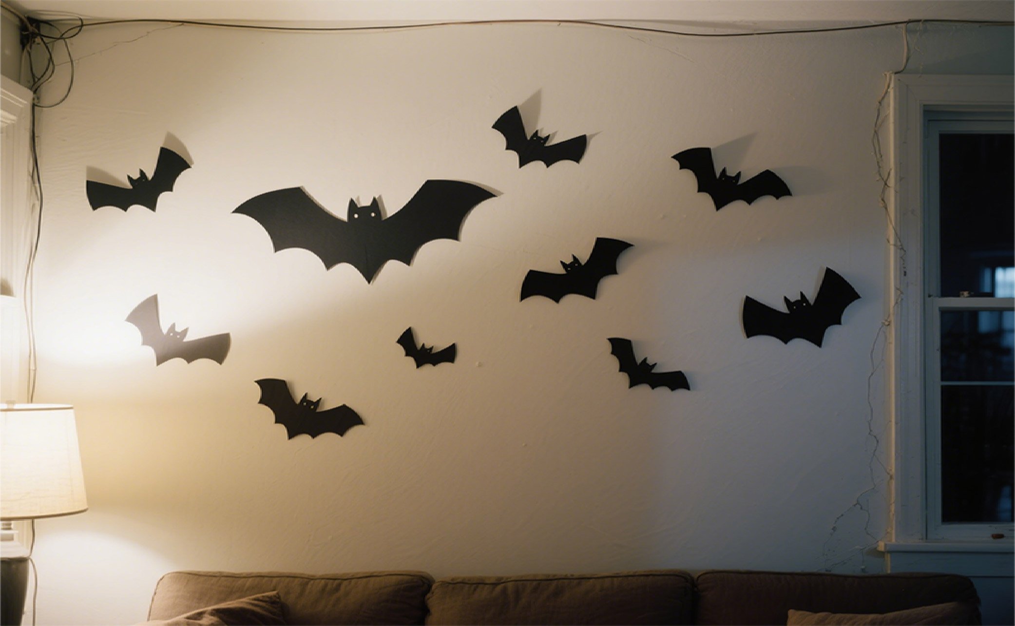 As I walked through her dimly lit hallway, I gasped. Flying across her walls were dozens of bats that seemed to be glowing from within, casting eerie shadows that made them appear to be actually flying. The effect was mesmerizing—not cheesy or tacky like most Halloween decorations, but elegant and genuinely spine-tingling.