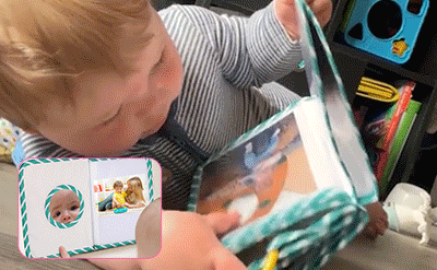 "This photo book is absolutely genius! I've been looking for a way to easily share our family photos with my baby, and this is perfect. Seeing familiar faces makes her light up every time, and it's so much more personal than just swiping on a screen. It's already a cherished keepsake that captures her first year beautifully."