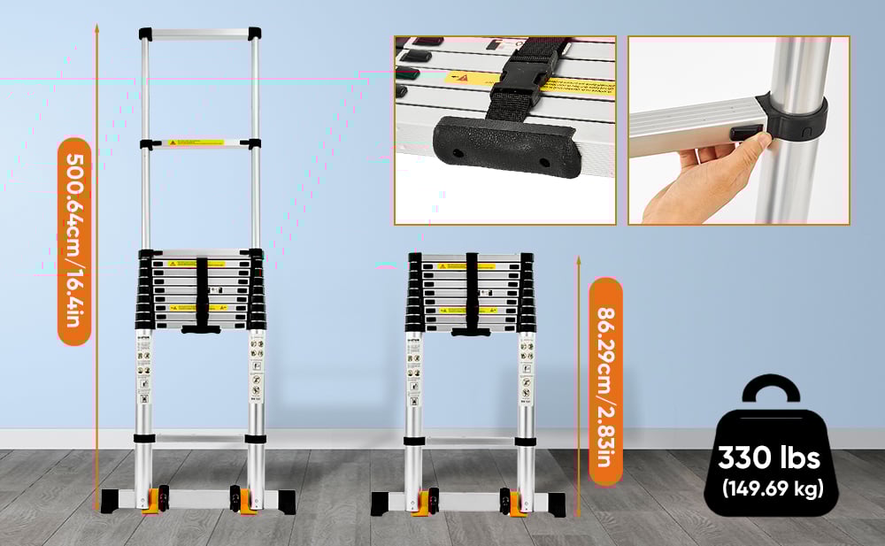 The Sakerplus ladder is made from aerospace-grade aluminum, featuring a revolutionary telescoping design that allows it to collapse down to just 2.83 feet (86.29 cm)—small enough to store under the bed, in a closet, or even in the trunk of your car. When fully extended, it reaches 16.4 feet (500.64 cm) and supports up to 330 pounds (149.69 kg)—plenty for all the tasks you need to tackle.