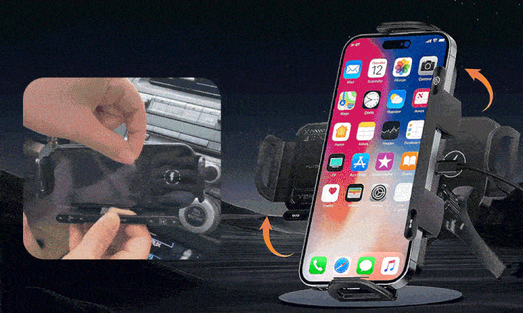 🔄Intelligent Rotation System: Press one button to rotate your phone 90° instantly—perfect for switching between navigation (vertical) and media apps (horizontal) without taking your hands off the wheel.