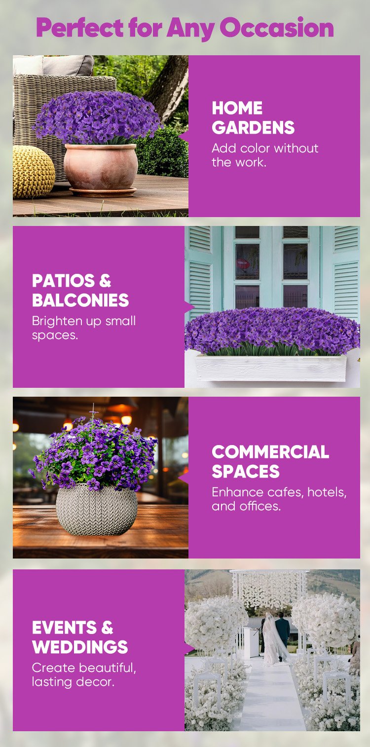 Loved how flexible the stems were—easy to bend and shape for a natural look. Placed them in pots and flower beds, and they blend seamlessly with real plants.