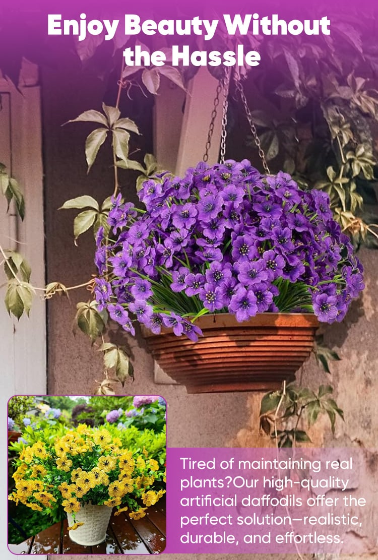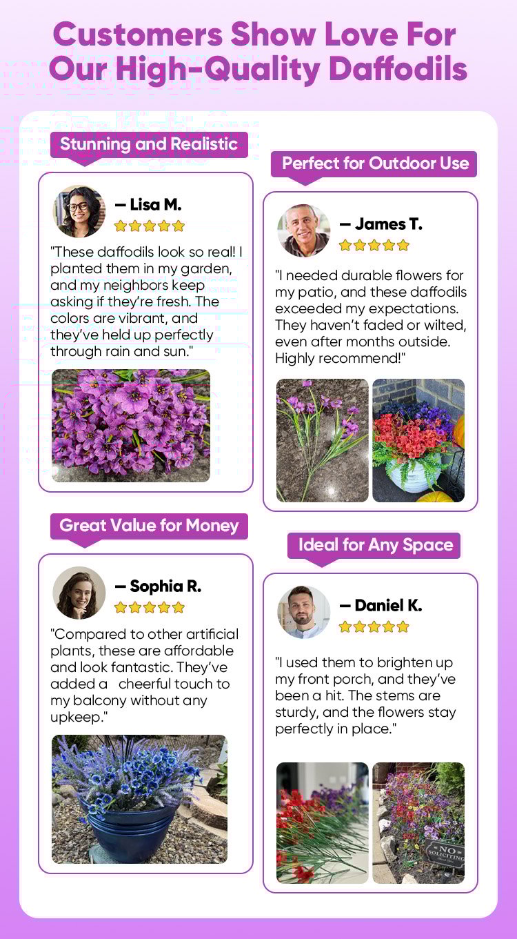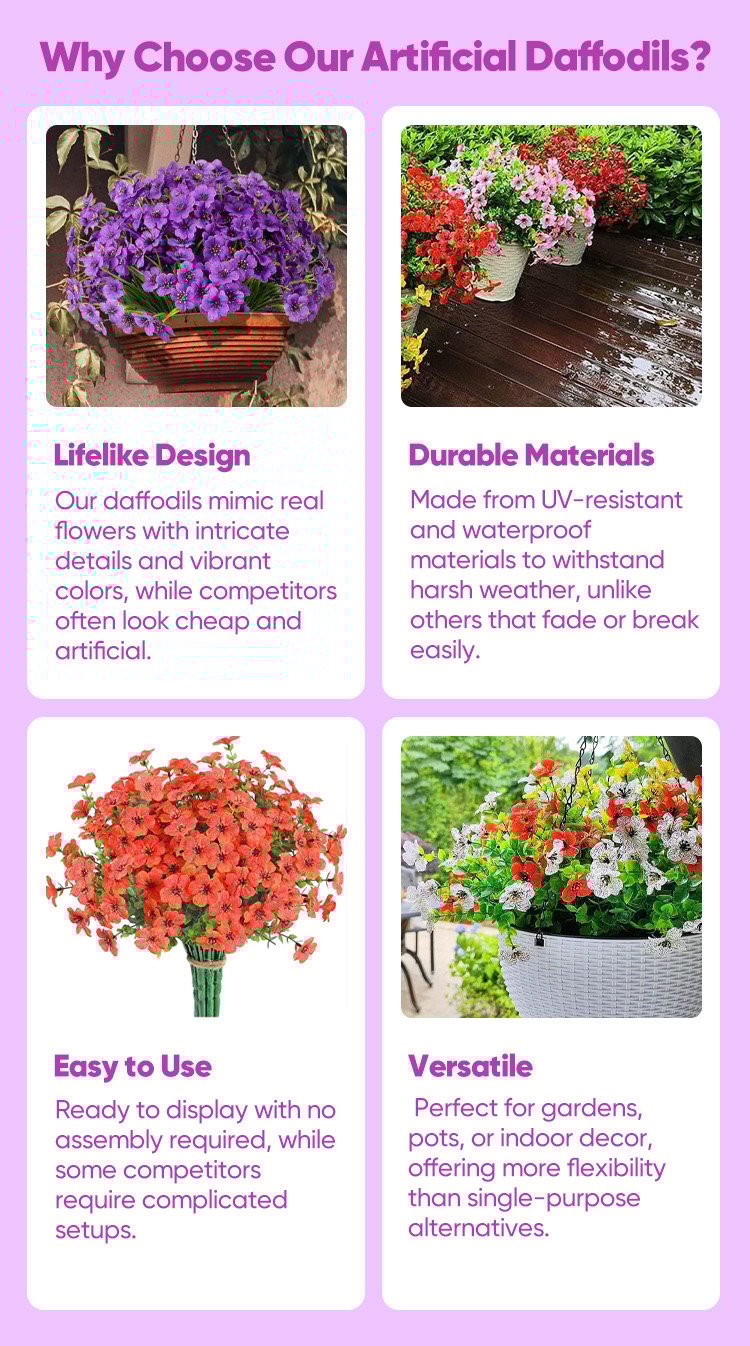 These artificial daffodils look incredibly real, even up close. The colors are bright, and the stems have a natural bend. Perfect for adding a pop of spring to my garden without any maintenance.