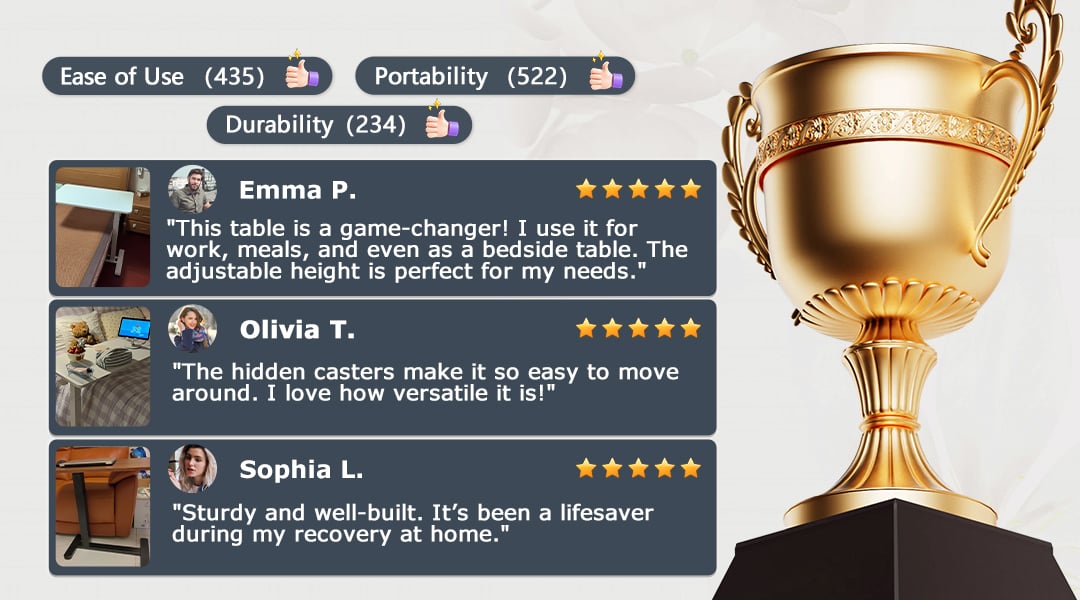 Whether you're working from bed or just enjoying breakfast in the morning, this table is a lifesaver. The adjustable height and smooth-rolling casters make it so convenient to use. It's well-built and looks great in any room. Five stars all the way!
