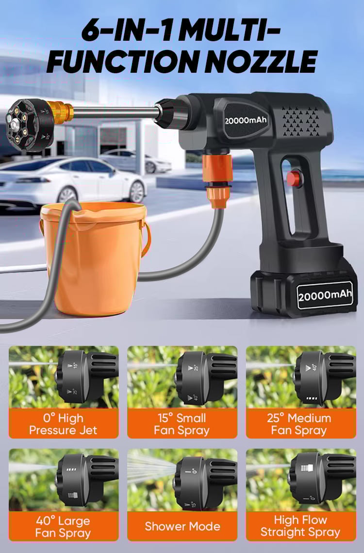 Commercial pressure washer is equipped with a detachable 20000mAh large-capacity lithium battery with continuous output, a full charge can provide you with 50-60 minutes of uninterrupted cleaning time., Effortlessly monitor battery life on the sleek digital display, ensuring an optimized cleaning experience every time.